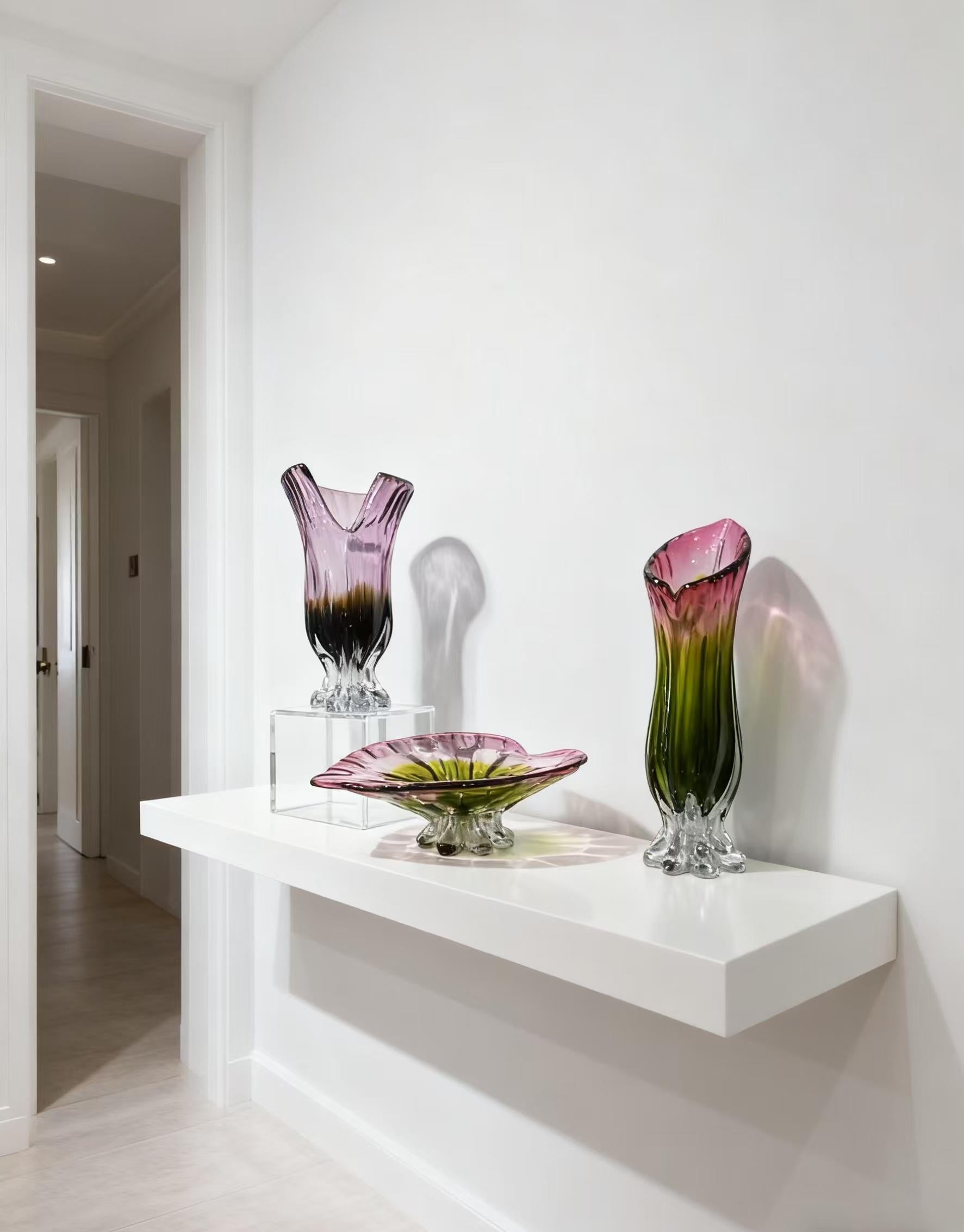 Inspired by the gentle harmony of dawn’s first light, the Aurora Bloom Crystal Vase & Bowl Set from Moods Illumina captures nature’s poetry in glass. Each piece is hand-blown with intricate transitions of soft pink, emerald, and clear crystal — echoing the tender glow of blooming petals at sunrise.