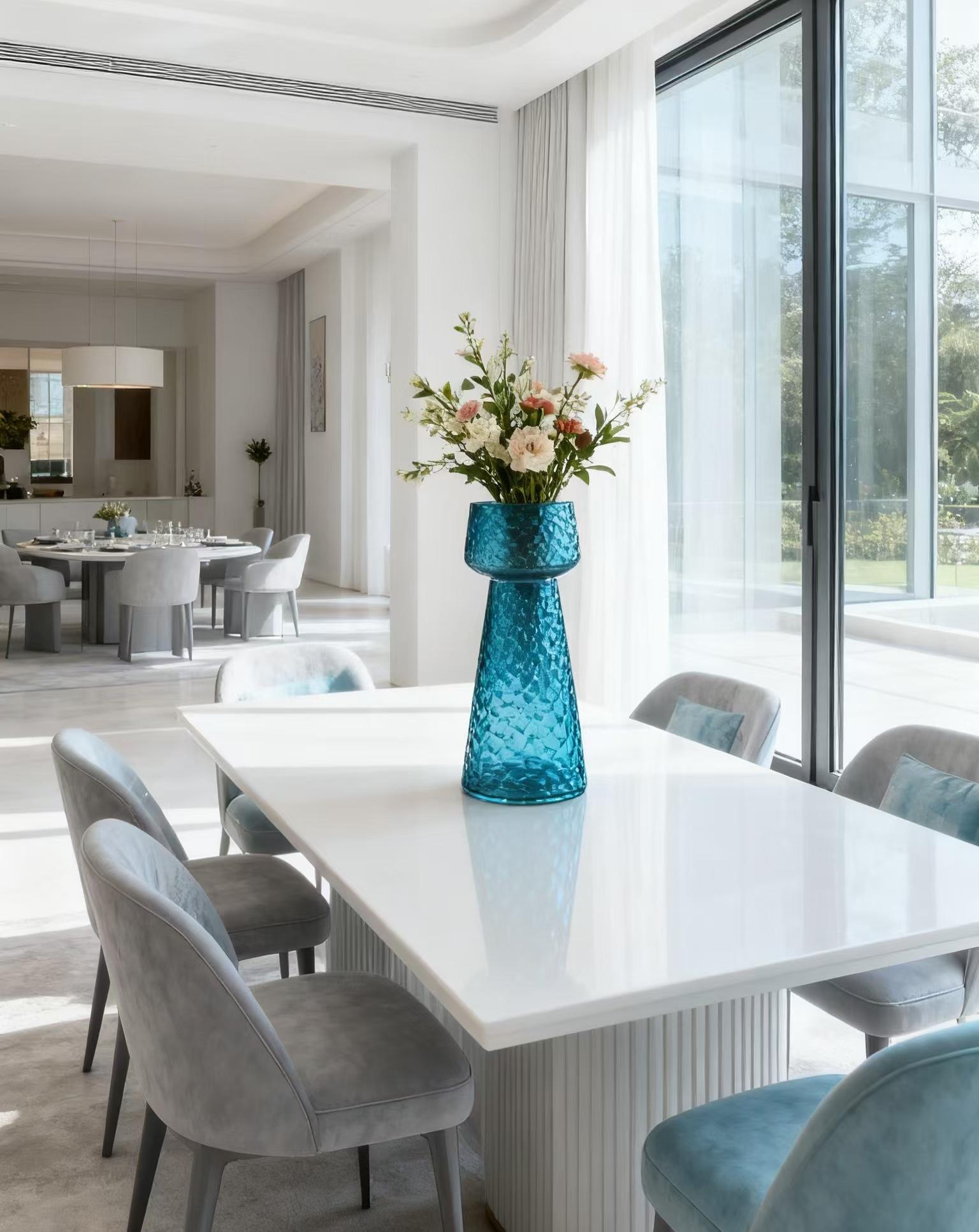 Its minimal yet striking silhouette makes it an ideal centerpiece for modern interiors — balancing clean geometry with a sense of fluid artistry. Whether filled with flowers or displayed as a standalone design statement, it brings a touch of coastal luxury to any setting.