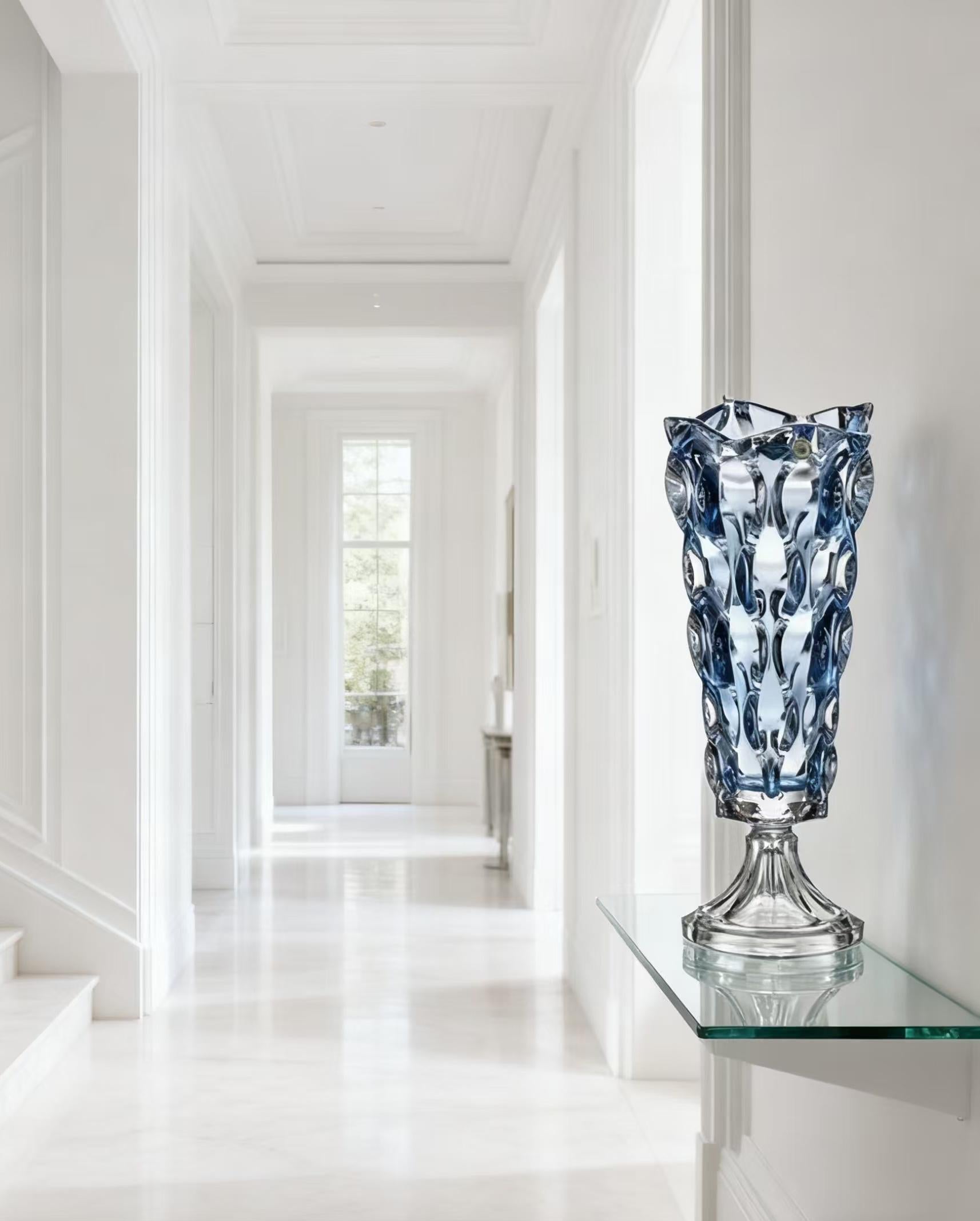 Inspired by the fluid beauty of rippling water and sculptural precision, the Celestial Ripple Pedestal Crystal Vase from Moods Illumina captures timeless elegance in crystal form. Each vase is meticulously hand-blown and shaped to perfection, featuring intricate wave-like contours that shimmer beautifully with ambient light.