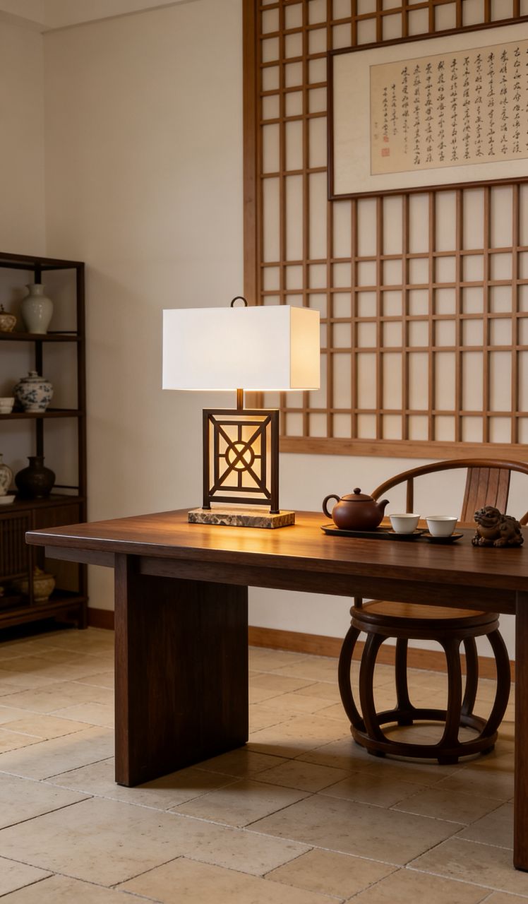 Englewood Classical Trelliage Pattern Lamp  29''Ht.,Metal & Granite  Bronze Finish  17/9.5 x 17/9.5 x 10 White Linen Rectangle Shade