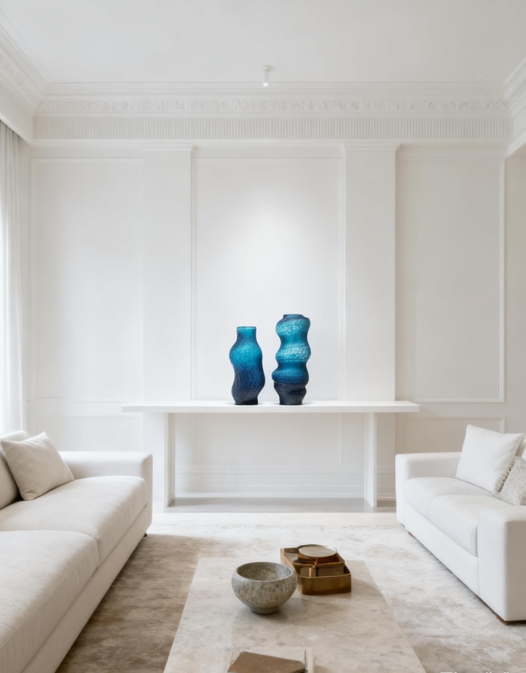 The rich blue hue, transitioning subtly through gradients of marine and indigo, reflects light beautifully — adding texture and depth to any contemporary or classic décor. Whether styled with dried botanicals, fresh florals, or displayed as standalone art, these vases redefine understated luxury.