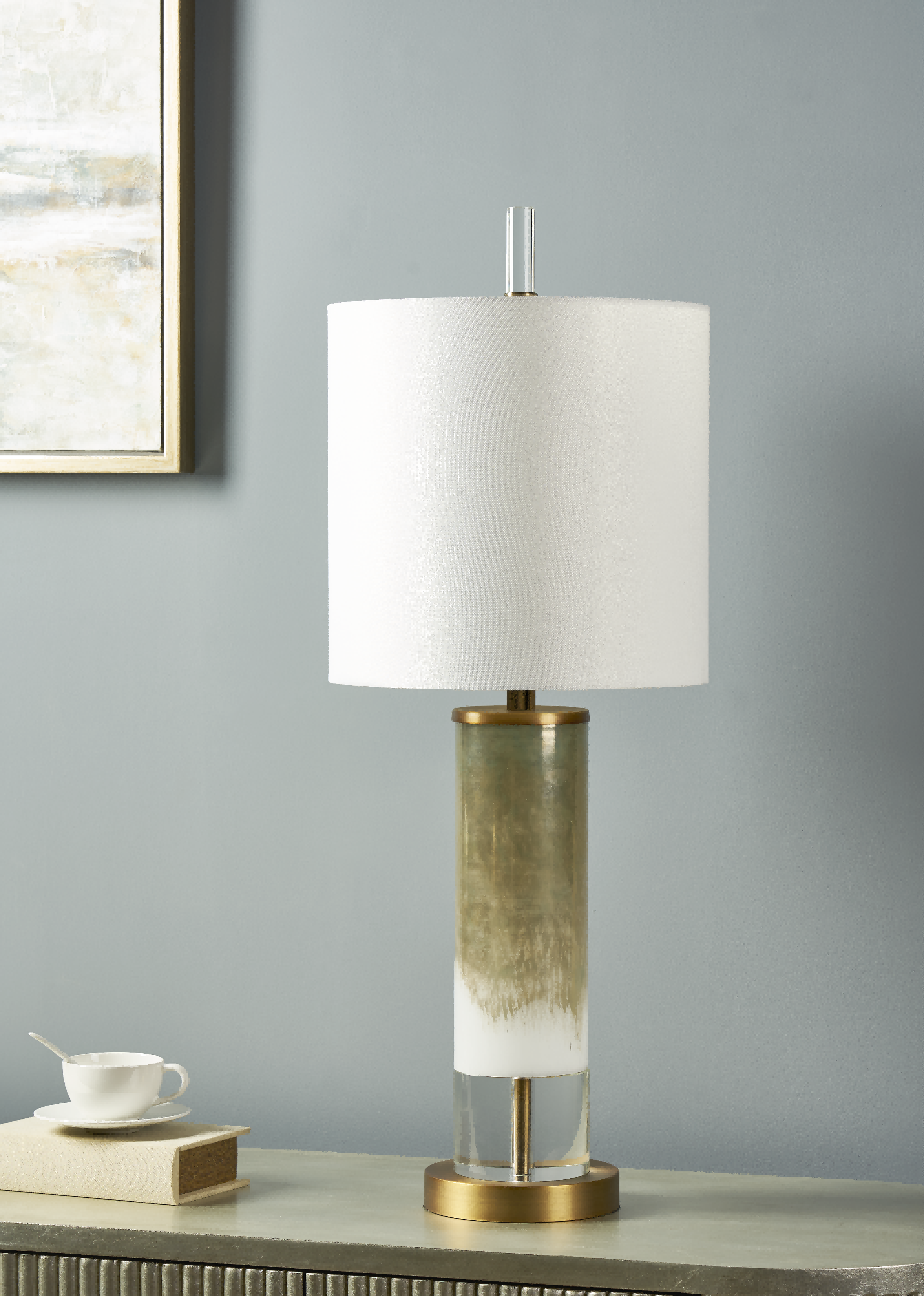 Wyatt Table Lamp with Nightlight  34''Ht.,Glass & Crystal & Metal  Brown Glazy Glass & Crystal & Antique Brass Finish  13 x 13 x 13 White Linen Cylinder Shade